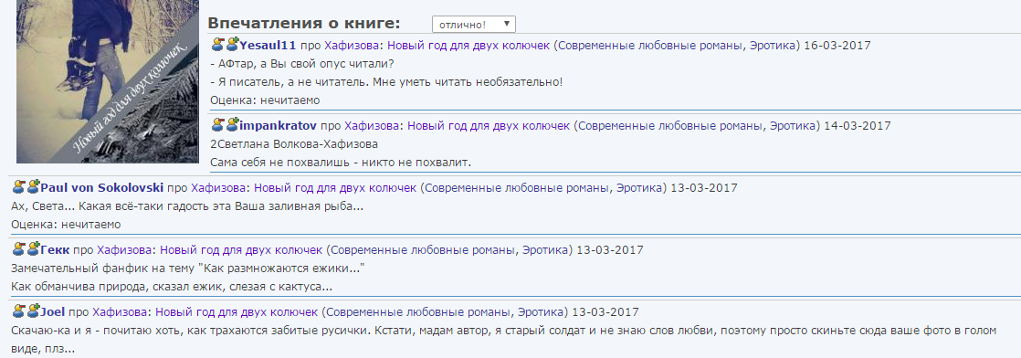 Forums: Я не буду много писать, меня интересует два вопроса: 1. Что обозначает значок качества около названия произведения? 2. Дорогие писаки комментов, скажите, а есть какие-то границы вашего невоспитания , необразования, нечеловечности и недоброты? Сажите, вы читали мою биографию или находили меня где-то в непотребных местах, позах и действиях, чтобы позволять себе проходиться по моей личности? Вам не нравится мой роман? не вопрос! Я не 100 долларовая купюра, чтобы нравиться всем. Но я не увидела критики по существу текста, а лишь нападки на мою личность: Впечатления о книге: Yesaul11 про Хафизова: Новый год для двух колючек (Современные любовные романы, Эротика) 16-03-2017 - АФтар, а Вы свой опус читали? - Я писатель, а не читатель. Мне уметь читать необязательно! Оценка: нечитаемо impankratov про Хафизова: Новый год для двух колючек (Современные любовные романы, Эротика) 14-03-2017 2Светлана Волкова-Хафизова Сама себя не похвалишь - никто не похвалит. Paul von Sokolovski про Хафизова: Новый год для двух колючек (Современные любовные романы, Эротика) 13-03-2017 Ах, Света... Какая всё-таки гадость эта Ваша заливная рыба... Оценка: нечитаемо Гекк про Хафизова: Новый год для двух колючек (Современные любовные романы, Эротика) 13-03-2017 Замечательный фанфик на тему "Как размножаются ежики..." Как обманчива природа, сказал ежик, слезая с кактуса... Joel про Хафизова: Новый год для двух колючек (Современные любовные романы, Эротика) 13-03-2017 Скачаю-ка и я - почитаю хоть, как трахаются забитые русички. Кстати, мадам автор, я старый солдат и не знаю слов любви, поэтому просто скиньте сюда ваше фото в голом виде, плз... Отвечу всем: 1. Yesaul11 вы не поверите, но я еще и успешно продаю роман и пару недель занимала в ТОПе верхнюю строчку, получила кучу замечательных рецензий и откликов читателей, а так же предложение крупного издателя включить роман в сборник похожих по жанру. Представляете?! И да, я начинающий писатель, но вполне уже успешный. Вам есть чем похвалить себя? нет? Чао. 2. impankratov разумеется. а это зазорно? или я должна дать своему произведению оценку НЕЧИТАЕМО? 3. Paul von Sokolovski я не писала сборника рецептов. Не ваш роман- не вопрос. Почему гадость? не приемлете сам жанр? зачем читали? 4. Гекк я фанфики не пишу. это, похоже, ваша область. как раз комментарий и есть ваш фанфик на мое произведение. по существу снова ноль. я смотрю, за Joel просто по пятам следуешь. не одно ли вы лицо? 5. Joel я тут недолго, но наслышана, наслышана. комменты почитала, можно было и не реагировать, но обещала же ответить, отвечаю: я не русичка, я русская. а фамилия- по мужу))) да, он татарин, у нас многонациональное государство, не знал? по-поводу фото в голом виде... я даже не знаю, как можно комментировать это.. ты дебил? или просто интернет все разрешает и вы далеко, в морду не получите? так вот подойди к зеркалу и онанируй. андестенд? И всем прочим: Я И МОИ КНИГИ НЕ 1000 БАКСОВ И ВСЕМ НРАВИТЬСЯ НЕ ОБЯЗАНЫ, А ПОТОМУ НЕ НРАВИТСЯ- НЕ НАДО. Я НЕ РАССТРОИЛАСЬ.НА 396 ПРОЧИТАННЫХ ПЯТЬ НЕЗНАЧИТЕЛЬНЫХ НЕ ПО КНИГЕ, А ПО ЛИЧНОСТИ КОММЕНТОВ- ЛИБО МАЛО НАПИСАЛА И КОНЧИТЬ НЕ УСПЕЛИ, ЛИБО ОРИЕНТАЦИЯ НЕ ГЕТЕРО. И напоследок: Рецензия на "колючек", которые готовятся к публикации на литресе, в гугл плее, амазоне и далее по списку, плюс готовится выход в печатном варианте. так вот к рецензии: "Дорогие друзья по чтению. Книга "Новый год для двух колючек" Хафизова Светлана Леонидовна произ